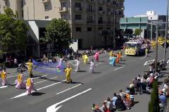 法轮大法学员的游行方阵由三个身穿仙女装的学员手捧着“真,善,忍”三个大字走在队伍的最前面。后面是三个身着莲花装的学员提着花篮,送给两边的儿童纸叠的莲花。很多人,包括一些华人家长都伸手要莲花给他们的小孩。唐装舞队紧随其后,她们不时的翩翩起舞,引起观众的阵阵掌声。后面的花车上有身穿金色炼功服的学员和大法小弟子展示功法。车上两名彩装的学员向观众抛撒五彩的花瓣。大法小弟子们也纷纷加入撒花瓣,使两边的儿童都为之欢呼雀跃。花车后面是腰鼓队。