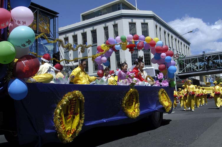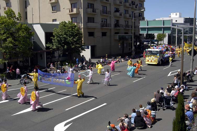 游行队伍前后都有法轮大法横幅。一路上,观众们向学员招手微笑,并祝学员们圣诞快乐。观众中有很多华人,他们有的表露惊讶之情,有的脸上带着微笑向学员们招手,有的拿出照相机,录像机拍摄法轮功学员们的游行队伍。 当队伍经过主会场时,解说员说:“这是法轮功的方阵!真!善!忍!欢迎到基督城来! 法轮功在中国正遭受迫害。”游行结束后,大家都为此次游行的成功感到高兴。