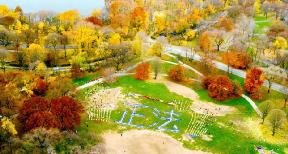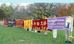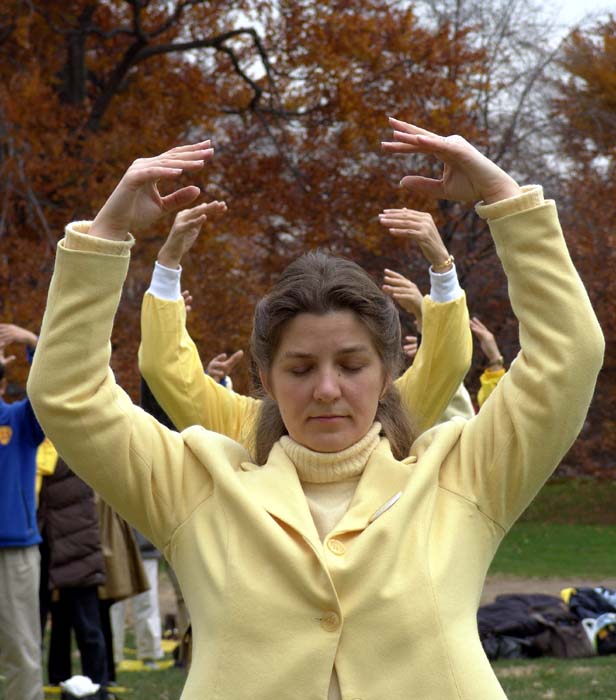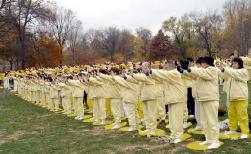 【明慧网2004年11月24日】2004年11月23日美国感恩节前夕,纽约曼哈顿中央公园东面,在一棵棵红绿黄桔色充满秋意的枫树之间,千名法轮功学员排出了两个醒目的大字“正法”,配上“法轮大法好”、“世界需要真善忍”的大横幅成为纽约东街的一个奇特的景观。悠扬的炼功音乐和祥和的炼功场面,令很多过往的行人以及马路对面的大楼里工作的很多职员或驻足或隔窗观看。很多路人赞叹法轮功真的好。