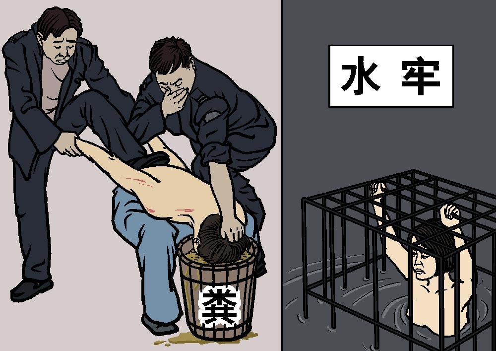 还有将学员浸泡在污水或粪水中,谓之“水牢”。其它折磨还包括竹签钉指甲,住天棚、地板和墙上长满红、绿、黄、白等长毛的房间,用狼狗、毒蛇和蝎子咬,注射摧毁神经的药物,以及其他种种千奇百怪的折磨。