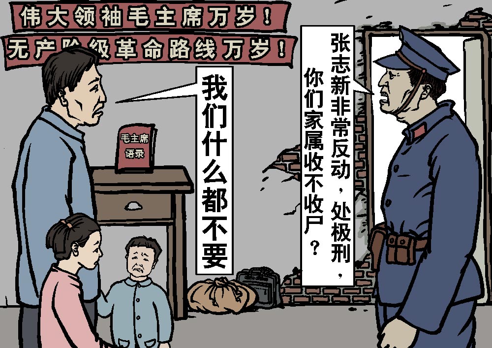张志新的女儿林林回忆起1975年初春的一段经历:“沈阳法院来的人大声说:‘你妈妈非常反动,不接受改造,顽固不化,反对伟大领袖毛主席,反对战无不胜的毛泽东思想,反对毛主席的无产阶级革命路线,罪上加罪,政府考虑加刑。如果处以极刑,你是什么态度?’……我愣住了,不知道怎样回答。我的心一下碎了。但我强装镇静,强忍着泪。爸爸说过,不能在别人面前掉泪,不然就同妈妈划不清界限了。爸爸代我回答说:‘如果确实那情况,政府怎么处理都行。’法院的人又问:‘处极刑,收不收尸?张志新狱中的东西你们还要不要?’我低着头没说话。爸爸又代我说:‘我们什么都不要。’……爸爸领着我和弟弟从县城招待所出来,跌跌撞撞,顶着呼啸的风雪回到家。没有做饭,爸爸将家里仅剩的一个窝窝掰成两半,分给我和弟弟吃,说:‘吃了早点睡觉。’我静静地躺在炕上。爸爸独个儿坐在小板凳上,对着灯发愣,他瞅了瞅炕上,以为我和弟弟睡着了,就慢慢地站起来,轻轻地把沈阳家里带来的箱子打开,翻出妈妈的照片。看着看着,爸爸禁不住流泪了。我翻下床,一头扑进爸爸的怀抱,放声大哭。爸爸拍着我,说:“不能这样,不能让邻居听到。”听到哭声,弟弟醒来了。爸爸把我和弟弟紧紧地搂在怀里。这一夜,我们不知流了多少泪,却不能大声哭。”