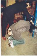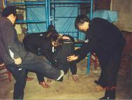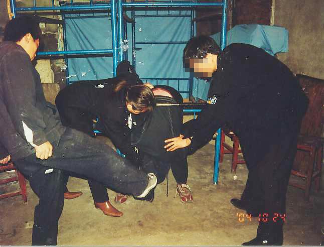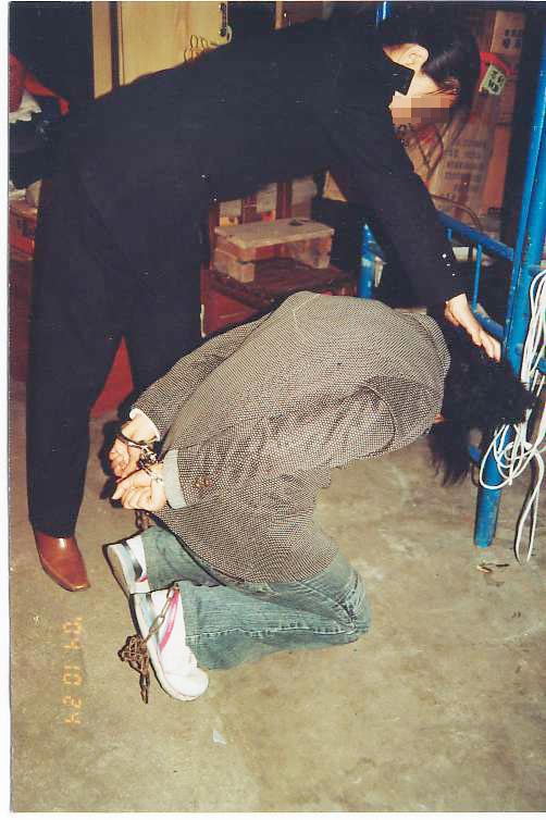 图二、北京房山看守所对進京的大法弟子残酷迫害,将大法弟子的头从裆部塞到后面绑上,人几乎窒息。