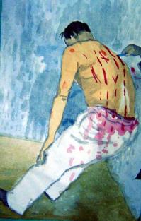 扒光衣服,只留下裤头,泼冷水,将牙刷折断,用力划后背,流血继续泼冷水,然后按在床上给上药,说让一宿就脱皮。