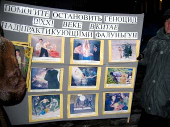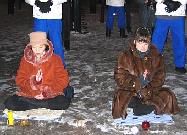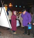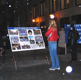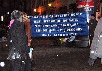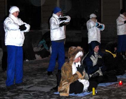 虽然圣彼得堡这一天下着大雪,并且刺骨的寒风多次熄灭点燃着的蜡烛。但是,学员都不为这一切所动,他们依旧平和的展示着功法,发着正念,并向路人边发资料,边讲真象。过路的行人提出了很多问题,学员都一一做了解答。很多人对正发生在中国的这场迫害又惊讶,又愤怒。还有一些人明白真象后,直接表示要去炼功点学功。