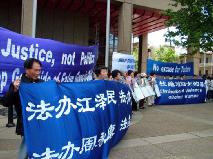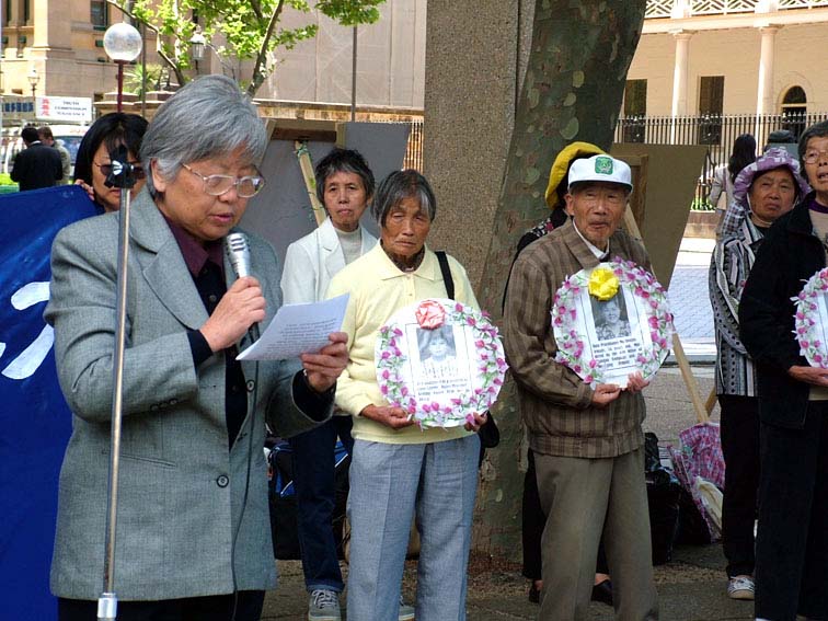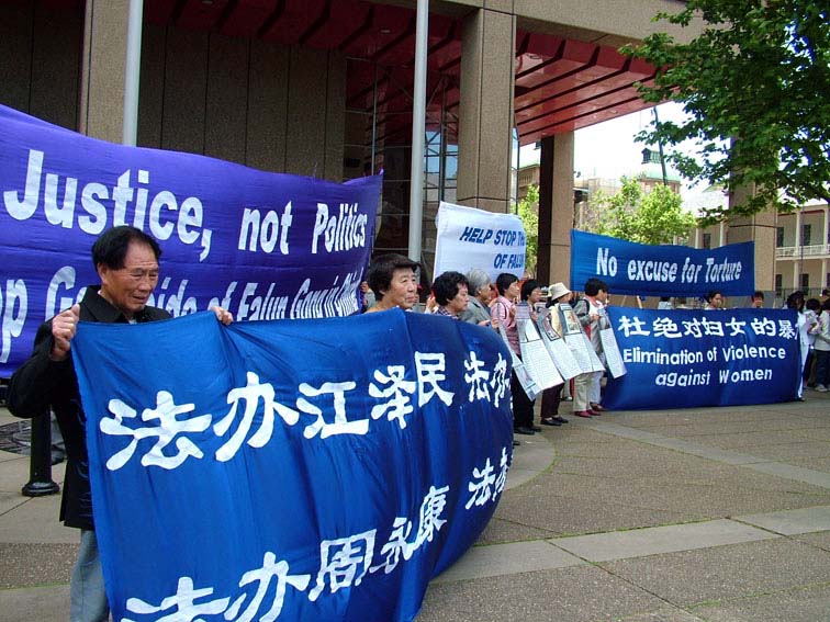 几名身着白衣的法轮功女学员在集会上讲述她们各自曾经在中国所遭受的酷刑和暴力。其中澳籍华裔女画家章翠英女士在发言中说,她曾经为法轮功说一句公道话而在中国数次被抓,最后一次被关押了8个月,期间遭受了严重的暴力和精神摧残。她表示正因为她的这段惨痛经历,所以她在今年的9月15日向纽省高级法院以“酷刑”罪和“群体灭绝”罪,正式起诉前中国独裁者江泽民和主管法轮功的“610办公室”并要求相应的赔偿,纽省法院已经受理此案。据她透露起诉案已经有新的进展,12月10日法庭将进行有关此案的第一次讨论。