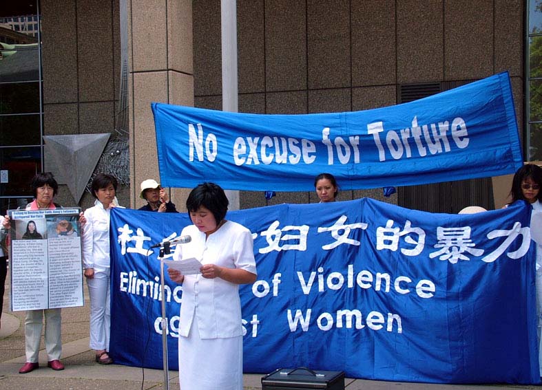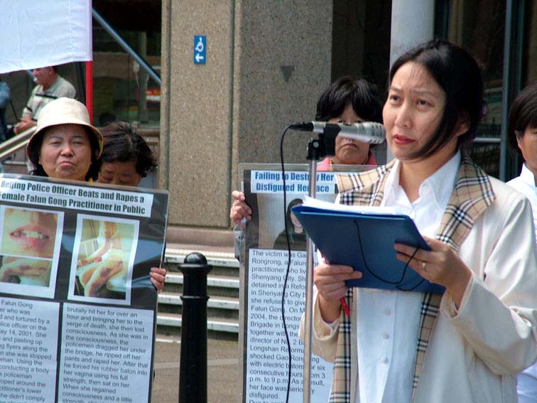 集会主持人希莲达(Sealand)女士表示集会上所陈述的只是冰山一角,据法轮大法资讯中心的资料表明,自99年7月至2004年9月的62个月以来,在被迫害致死的学员中,妇女占51.38%,平均每月有17名学员被折磨致死。她们的平均年龄为45岁,留下遗孤无人照管。更有不少女性法轮功学员遭恶警强暴和惨不忍睹的性迫害。如28岁的重庆大学女研究生魏星艳由于被怀疑在重庆大学校园放法轮功真象的汽球和条幅,被抓至重庆沙坪坝区白鹤林看守所,关押期间在2003年5月13日遭恶警当众强暴奸污后,魏星艳绝食抗议迫害,恶警强制灌食并插伤了她的气管和食道,造成她不能讲话,生命处于垂危之中,现在生死不明,据知情者指出,把此消息透露出来的法轮功学员被报复判重刑,凡是打听魏星艳消息的人都成了当地610员警抓捕的对象。