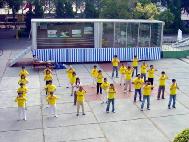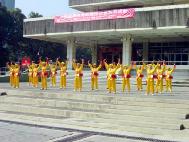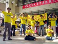活动的开幕式,由法轮功学员组成的腰鼓队上台表演“鼓乐神威”,学员们整齐画一的动作,刚柔并茂,表现出一种喜庆的气氛。精彩的演出让许多师生为之惊叹。