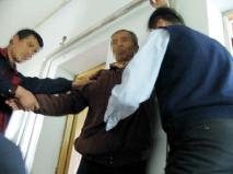 刑法:用手铐背剑式反扣双臂,弓身,直膝,撅臀,头低过臀部一直用刑三个多小时。然后由两名恶警悬提架空身躯往地下墩,直到腿骨酥软不能站立,腰不能直,腕部勒出血痕印也不罢休。