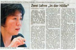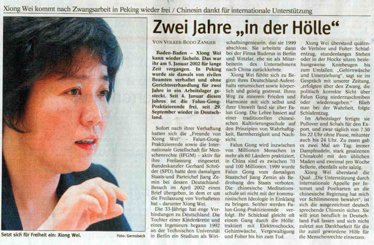 今年1月4日,这位法轮功修炼者获得自由,9月29日重回德国。熊伟说,“网上的国际支持、声援和寄给中国政府的明信片使我得以免遭受最恶劣的(酷刑)。”她感谢人们对她的帮助,她表示也要为人权尽一份力量。