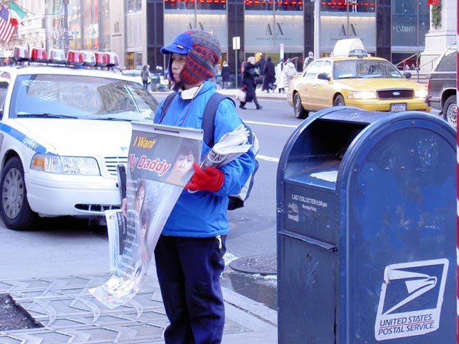 这次来到曼哈顿,与香港之行不同,走上纽约市街的第一天,就开始发真象资料,心里揣测着人们如何才会拿材料,除了展现修炼人善良的一面,心里持续发正念,嘴里也大声喊着:“Please read our story(请读一读我们的故事)”。