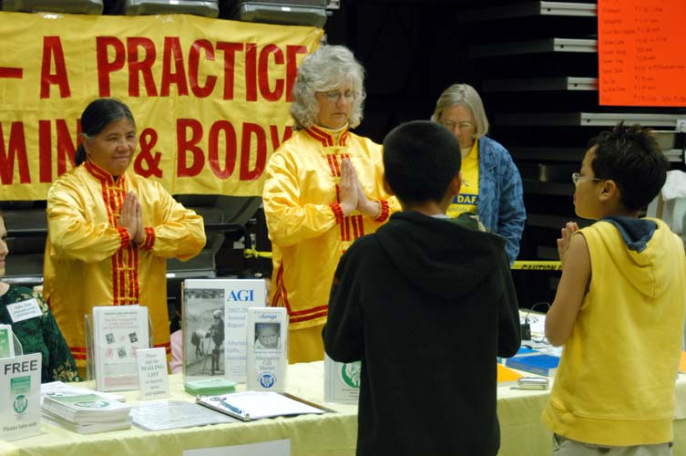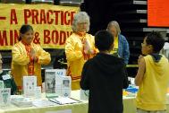 拿到资料后,许多人询问如何可以尽快学炼功法和购买法轮大法书籍,两个十多岁的孩子当即就开始学习功法,久久不愿离去。当人们听到法轮功在中国受到残酷迫害的事实时,一致谴责镇压者的荒唐,一些人主动询问如何可以帮助受迫害的法轮功学员们。