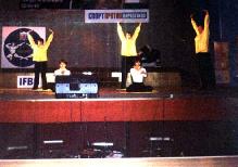 【明慧网2004年11月5日】近日,俄罗斯五山城法轮功学员应邀参加了主题为“体育战胜毒品”的社会宣传活动。在场的听众主要是青年人,学员们利用这个好机会办了一次法轮功展示会,向人们洪法和讲清真象,几位学员在台上演示功法,伴随着舒缓的炼功音乐,一位学员朗诵了一首洪法诗“什么是法轮大法”。表演结束,台下观众热烈鼓掌。