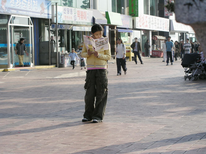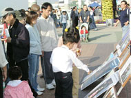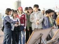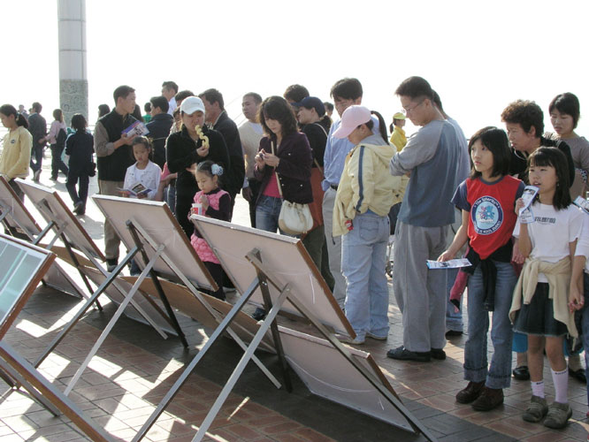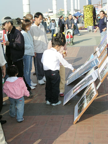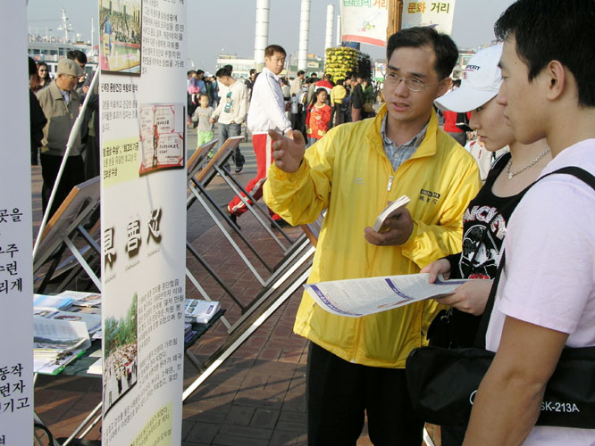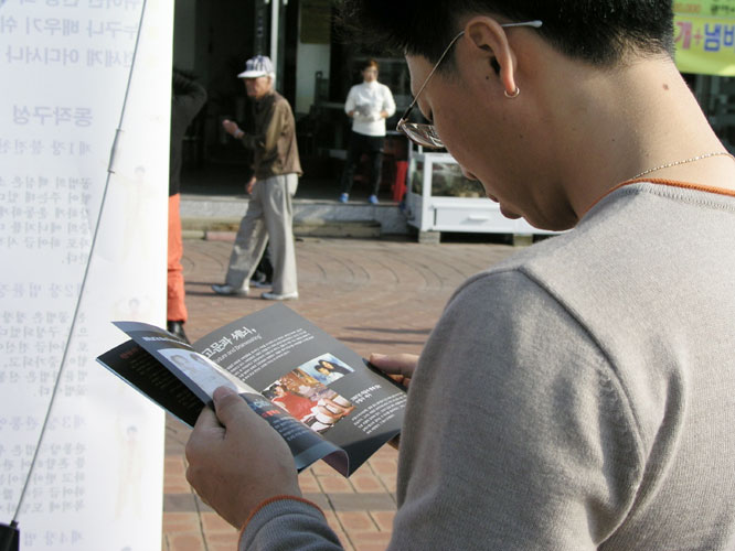 因为月尾岛是旅游观光地区,来了很多外国观光客,其中在韩国的中国学员担负了向中国人讲真相的重任。因为展板前云集的人太多,很多学员把自己讲解的位置让给了游人。