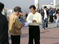 还有一个小学生在展板前走了好几个来回,然后不解的问:他们为什么被拷问?有小孩在修炼法轮功吗?小孩也会被拷问吗?等等既单纯又善良的问题。问遍了所有自己疑惑不解的问题后,就主动在救援声明上签了名。两个大学生听学员讲了很多真相,静静的听到了最后,然后说了一声: “谢谢你!”