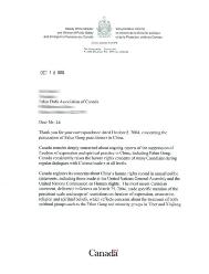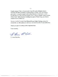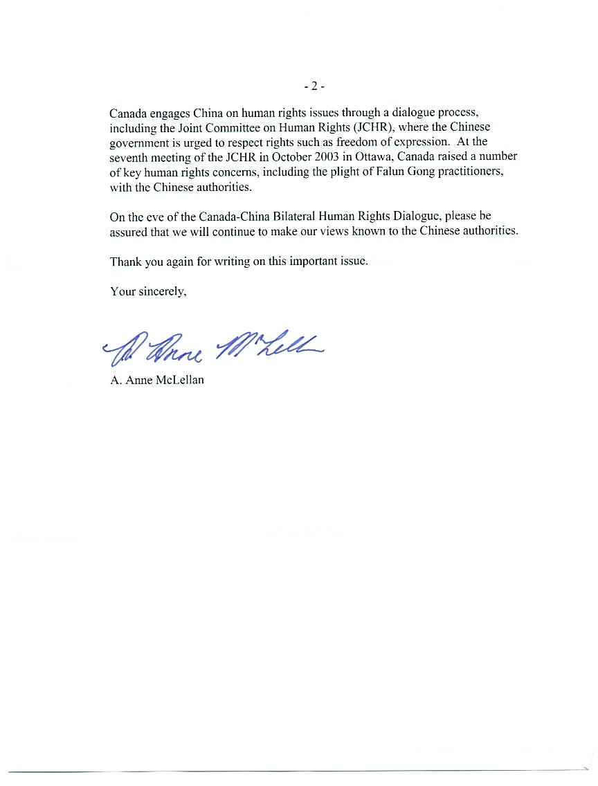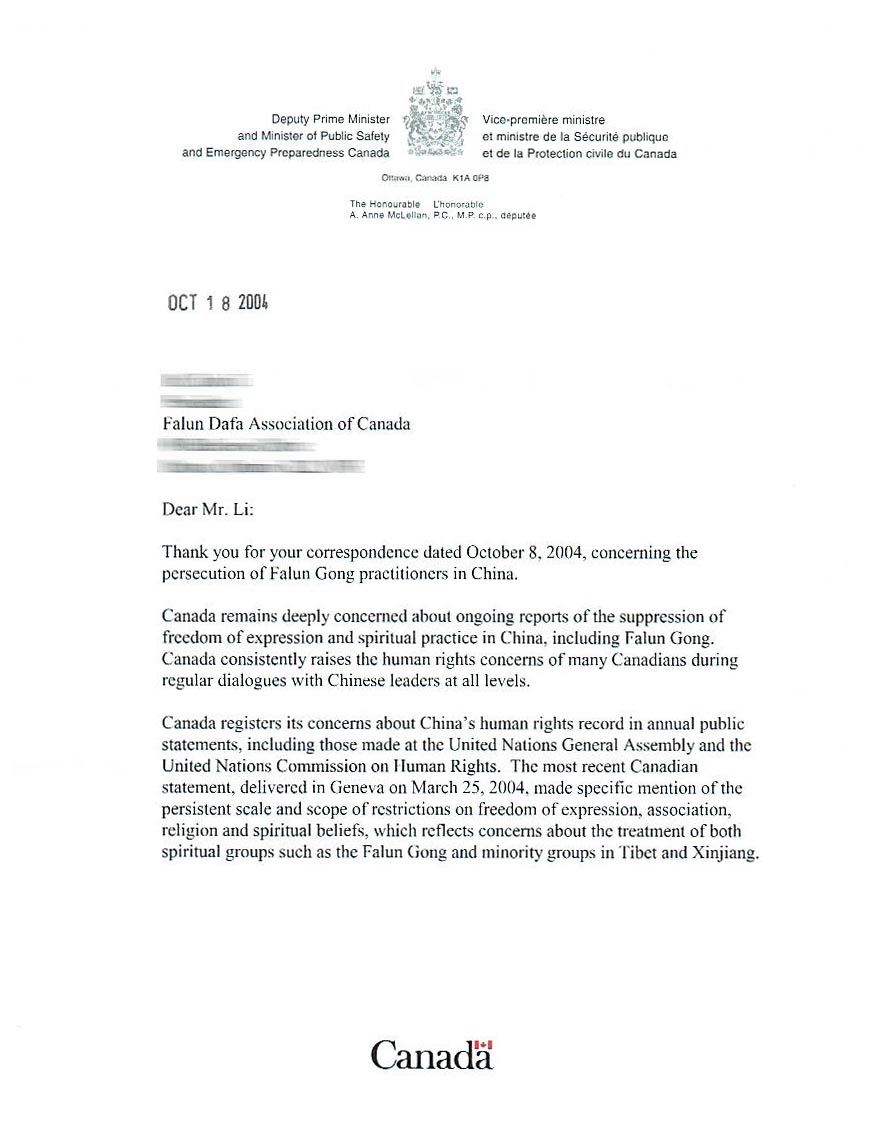 加拿大副总理安妮-麦可勒兰女士10月18日就加中双边人权对话之事回信时指出:“加拿大一直深深关注在中国言论自由和精神修炼,包括法轮功受到打压的报导。”信的全文如下: