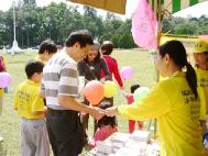 展位现场除了由学员派发简介和讲真象外,增设一项“闯关活动”颇获好评。只要能够背出“真、善、忍”三个字或能说出“真、善、忍是什么”的小朋友,就获奖励精美书签莲花以及印有“世界需要真善忍”字样的气球。带着小朋友来参观的家长,会在旁边帮忙背诵或提示小朋友“三个字是什么”。稚龄儿童在游戏中也和家长一起学习真、善、忍的内涵,许多小朋友在家长的帮助下能说出“真是说真话,做真事……”“善是存好心,做好人……”“忍是忍耐痛苦,原谅别人……”。