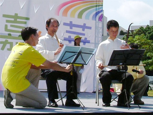 功法表演时,也穿插着国乐器的演奏,学员们以箫、二胡演奏学员的创作乐曲,并在解说曲目时,加入法轮功真象内容。如演奏“古怪歌”时,学员分析江氏集团伪造的天安门自焚事件及其多处明显的破绽;演奏“为你而来”时,介绍36名西人学员为了不让中国人受江氏谎言的毒害,而到天安门广场和平请愿举横幅;演奏“法轮大法好”,则说明法轮大法已使一亿多人身心受益,法轮功修心养性、强身健体的功效卓著,已获得到各国一千两百多项褒奖等。