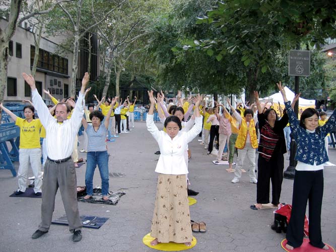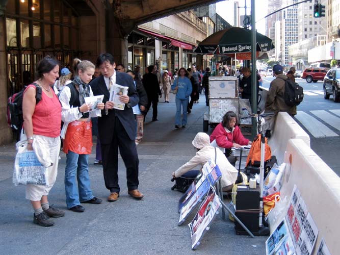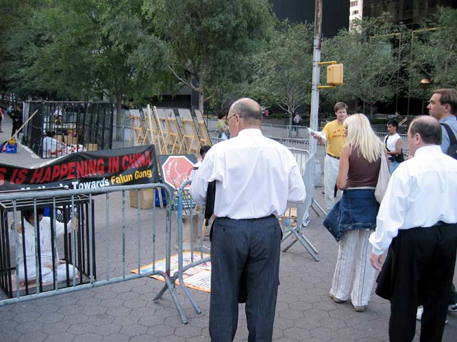 哦!原来这一群老先生老太太为了向世界人民讲述这场仍在中国发生的惨无人道的镇压法轮功的事件,希望世人一起帮助中国大陆的法轮功学员,早日停止这场迫害,自发性的,且自费千里迢迢的从台湾搭飞机至世界金融中心都市──纽约讲法轮功真象。