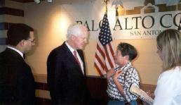 第二天考宁先生来到德州南部的圣安东尼奥市参加社区大学举办的新闻发布会,学员借此机会向他讲述了法轮功在中国遭受的迫害以及江氏政治流氓集团把迫害延伸至海外包括美国的情况,特别是数月前在南非发生的曾庆红雇凶杀人的恐怖主义行为,并谈到304号共同决议在制止江集团在全球施行国家恐怖主义起到的作用。西人学员则以切身经历介绍大法如何使自己受益等。考宁参议员和几位助手在时间很紧的情况下,非常仔细的听,最后郑重的说,“感谢你们来这里告诉我这些情况,我回去后一定把这些材料好好读一读。”