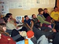 晚上,书店的小咖啡厅迎来了7位大法弟子,和15、6位有缘人。没有地方放椅子了,人们就坐在地毯上。咖啡厅四周墙壁上布满了介绍法轮大法的展板和文章。由于小岛人口较少,人人都互相熟识,犹如一个大家庭一般温暖。座谈会上,小岛的法轮功学员作了开场白。之后,新老学员一起给人们介绍大法修炼,播放法轮大法真象影片,朗读《论语》,作功法演示,并讲述在中国大陆正在发生的迫害。在问答中,人们提出了一些非常有深度的关于修炼的问题。比如,心性提高在修炼中的重要性、业力多的人是否难修炼、修炼大法除了自我解脱外是否有更重大的意义、谁的标准才是真正对的、如何看待英语《转法轮》不同的版本、修炼中的自我约束与现代人所倡导的自由、宗教与法轮大法的关系,等等。他们对迫害也提出了许多有意义的问题。学员们用亲身经历和理解一一作了解答。人们时而全神贯注、时而绽开笑容的表情,显示出他们心中很多的问题被解开了。整个座谈会进行了2个小时,人们才恋恋不舍的离开。