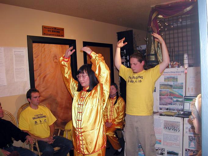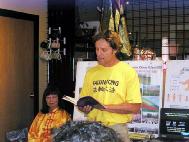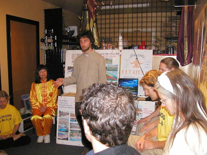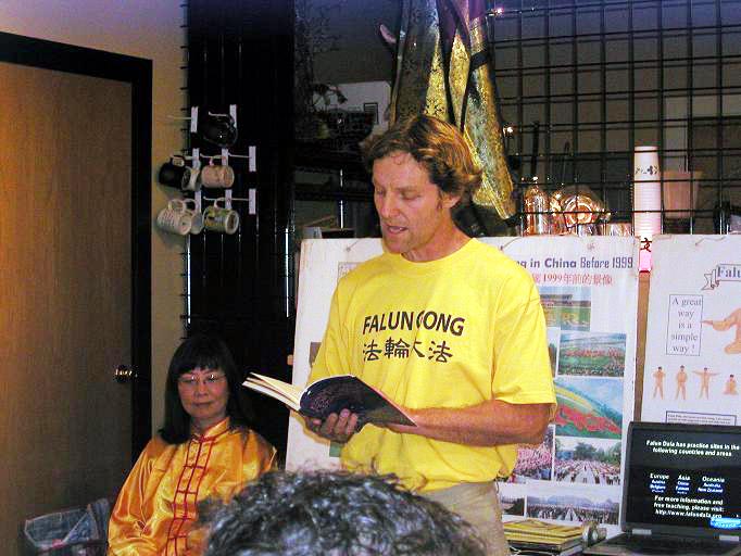今年春天,三位西人查询了法轮大法的网站,找到了他们一生追寻的真理。他们自己按教功录像学了功,自发组织学法,从此成为大法弟子中的一员。他们向亲朋洪法,告诉人们自己的修炼心得。小岛上一家叫“精神树”(Spirit Tree)的书店出售法轮大法英文书籍,也迎来了不少有缘人。时来时往,很多人提出了不少问题。为了帮助解答这些疑问,三位西人法轮功学员协同书店举办了一次座谈会,让人们从修炼、文化、和社会的角度了解法轮大法和在中国发生的迫害。