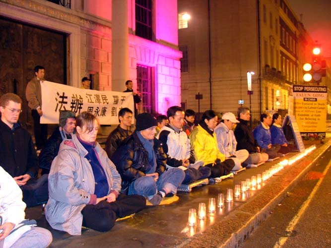 一排点燃的烛光整齐的摆在黑夜中静静的发正念的学员的前面。在法轮功学员身旁和身后的展板和横幅上分别写有“法办江泽民、罗干、周永康、刘京”的醒目标语。不少过路的市民围在法轮功真象展板前仔细的阅读。