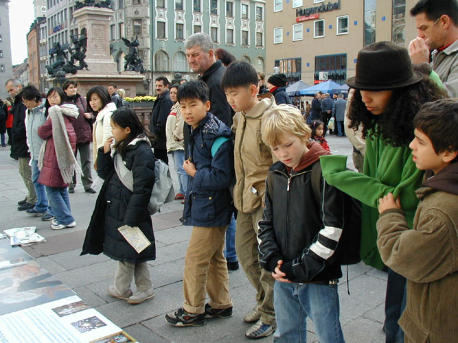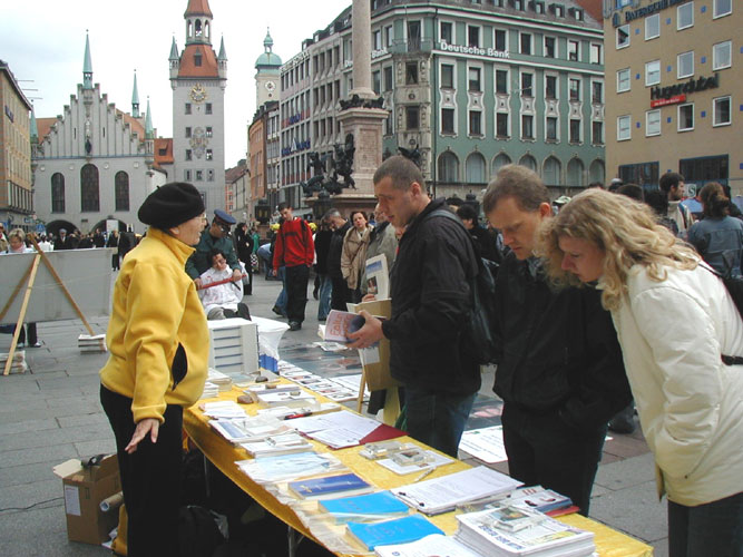 有一位德国女士告诉法轮功学员,她有一个画廊,最近有两位中国人要来办画展,她想让他们了解真象,她跟学员要了中文报纸,她希望会有很多的中国人来观看画展并了解法轮功真象。