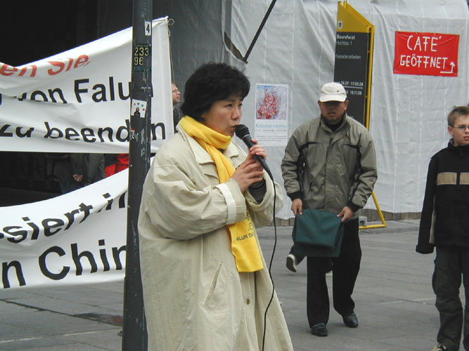 熊伟用她在中国劳教所两年的经历告诉在场的观众江氏集团对法轮功进行迫害的残酷性。在发言中,她特别感谢德国政府官员、人权组织和广大民众为营救她而作出的努力,呼吁全社会共同努力,停止在中国对法轮功的迫害。