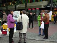 为了使人们真正了解真象,大家都很注重讲真象的实效,递上传单的同时,随口就讲解开了。大法洪传展板,酷刑真象展板,学员们祥和的炼功以及优美的炼功音乐,稍一加解说,善恶已然分明。这里的人们对法轮大法真象的反应越来越正面,很多人就是有耐心听真象,不听明白不离开。经常是几个学员同时向不同的人讲,一对一,一对二,或一对多个行人讲。明白了真象的人们,有的要签名反对迫害,有的想学功要炼功点的地址,当地负责义务联系的学员应接不暇,那边没回答完,这边已经又有人在等候。