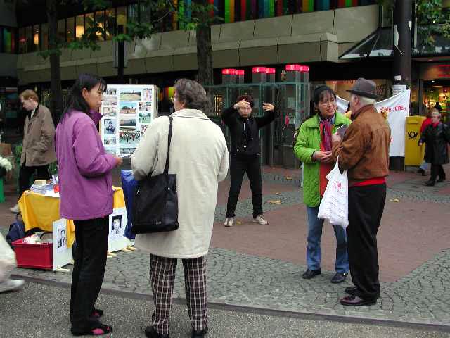 一开始却出现了意外情况,本来连续几个周末,当地学员一直是在市中心教堂前的一块空地上举办活动,来往行人对我们一目了然,今天早上来后一看,那块空地已被圣诞市场的商摊占用。怎么办呢?与巡警商讨后,学员们在第二个商业街口找到一个空地,仔细一看,原来就是一个摊位,只是没有人占用,一面与一个卖鲜花的摊位相邻,其它三面是人行道,来往的人很多。把展板等架设起来后,一些学员开始炼功,来往行人的目光很自然的就投向了展位。另一些学员就开始向游人发真象资料,同时讲真象。