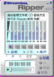 软件简介: Streambox Ripper号称急速转换大师,转换速度相当快,平均转换一只5分钟的歌曲可能只要不到1分钟的时间,可以說是目前转换速度最快的MP3音乐制作软件了。它可以将Real Audio格式转成MP3与WMA格式,将CD Audio转成MP3、WMA、和WAV这三种格式。