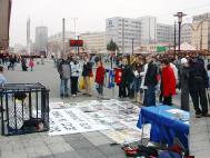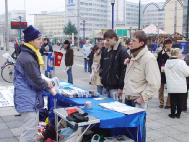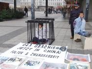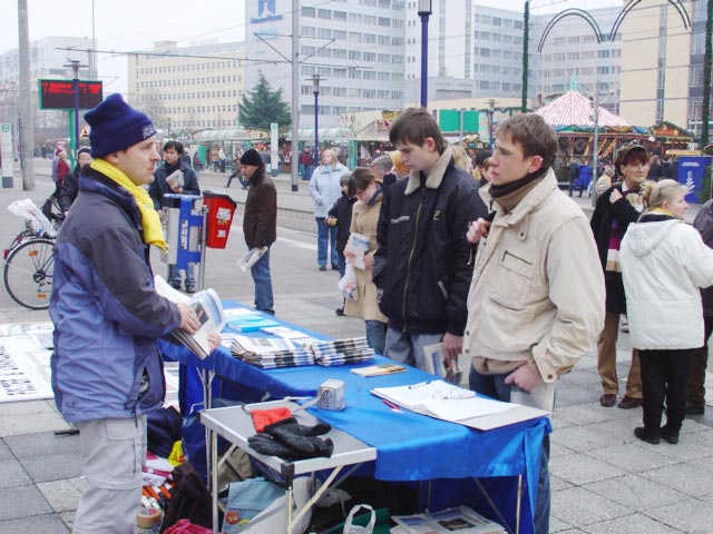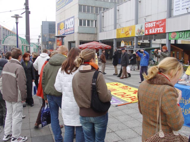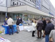 其中还有这样的一幕,活动刚刚开始不久,一个德国人来到活动地点,说这样的事情你们应该到中国去解决,不能在德国展示。这时来了另外一个穿着讲究的德国人说,为什么不能,中国这样迫害人权,应该让世界上所有的人都知道才对。后来学员与前面有疑问的德国人讲清了真象后,他主动留下联系地址,而且很友好的建议学员们不仅仅只在市中心搞活动,在市政府前的某某街,那里有很多人,也应该让那里人知道。