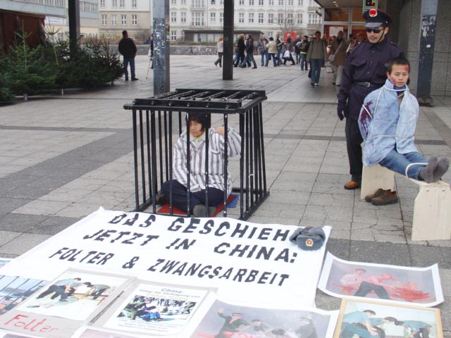酷刑展是当天活动中最震撼人心的部分。当扮演无辜受迫害学员和警察的几位学员刚一就位,就有大量的行人围上来观看。当看了一张张毫无人性的酷刑迫害图片和学员真实的演示,人们震惊并无法接受这样的事情会在今天的中国发生,说这似乎让他们回到了原东德时期,学员们说在中国所发生的实际上比这还要惨烈得多,这展出的还不到冰山的一角。