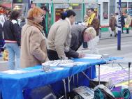 人们最常提出的问题是“为什么会这样”,当旁边的学员告诉他们仅仅是因为这些按照“真,善,忍”来要求自己做一个好人、手无寸铁的炼功群体不愿放弃自己的理念,而且象这样的迫害竟然持续了五年多和造成了至少1157人死亡,他们就问自己如何才能在制止这场非人性的残酷屠杀中发挥一点作用?他们要签名支持把江XX和“610”送上正义的审判台。当活动结束时,摆在桌上的签名表已满满的填了十三张,签名的人们有时是排着队等候。