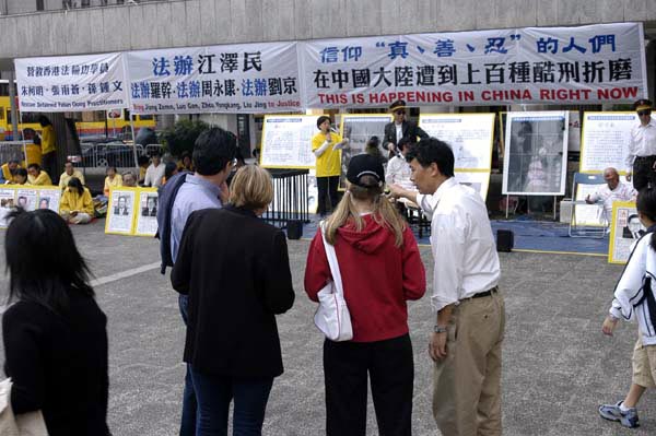 ![]() 香港学员在遮打花园办反酷刑展 | ![]() 学员向民众讲解酷刑 |