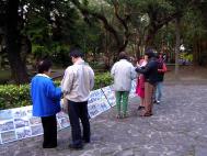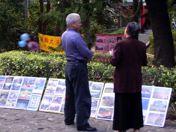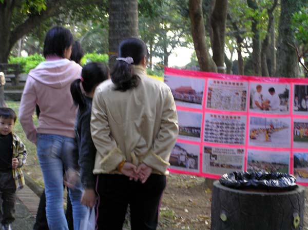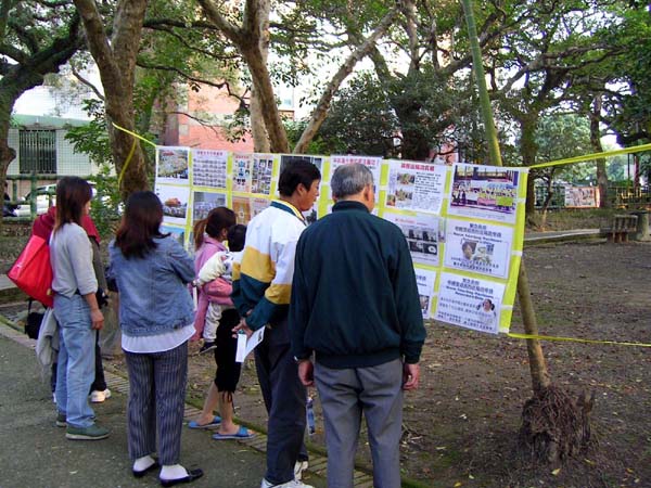 有位老先生在看板前,看了好一段时间了都不愿离去, 当学员上前问候他时,他愉快的叙述着:“这个功法我知道,人家炼的都说好!”当他看到内地残暴的对待这些修炼人时,一反他先前平顺的口吻大声的说:“共产党没道理,人家炼的好好的,受益了,却见不得人家好!真是没道理!”最后他将资料带走,不断的跟学员致谢着。一阵一阵的民众经过时,总是会自动的停下脚步来看看大法看板的内容,很自然的就对法轮大法有了基本的认识。