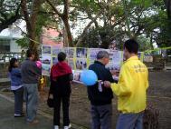 来往的行人中大部分都是全家共同出来游玩的,有不少小朋友的目光不断的注视着法轮功小学员手中的汽球。小学员年纪虽然小,可是又有礼貌又亲切的上前去说:“你好啊!汽球送给你,法轮大法好!!”小朋友们也高兴的说谢谢,而妈妈们总是愉快的笑着,看着我们给她的资料。其中一位妈妈点点头说:“看看这小学员,的确很纯净很乖巧。我们也可以让小孩学哦!”特别的是,有个一家四口出游的小男生,经过功法表演前面时,就主动跟妈妈说他想来学功呢。