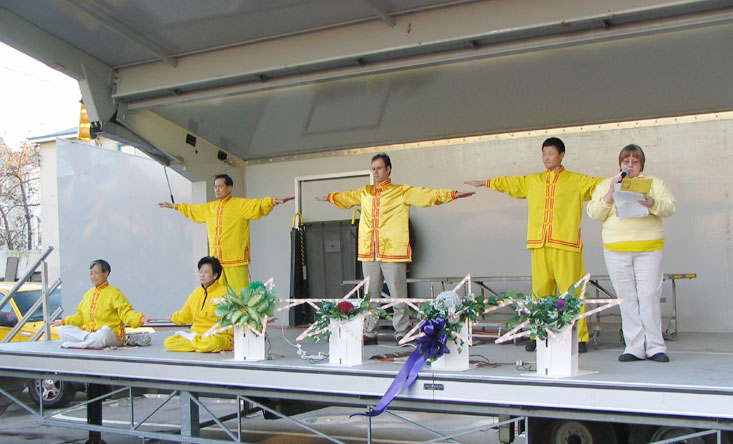 下午,5位学员在舞台上展示了优美舒展的五套功法,另一位西方学员同时向观众介绍功法和发生在中国的迫害。在喧闹的庆祝活动中,很多人都被这祥和的炼功场面所吸引,有些人甚至在台下模仿学员们的炼功动作。每个人都非常高兴的收下了法轮功资料。一位工作人员对学员说:“真高兴你们能来。太美了。”