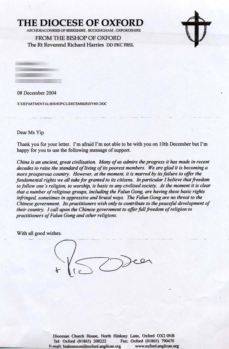 牛津大主教理查德·哈里斯先生在他的声援信中表示:“我虽然不能亲临你们12月10日的人权日活动,但我用以下书面信息表示支持:中国是一个古老伟大的民族。近十年来(在经济上)发展令人瞩目。然而,在此时,中国不能给他的人民提供最基本的权利,具体说,不能给人们宗教信仰和崇拜神的自由,而这种自由是任何文明社会的基础。现在很明显,许多宗教团体包括法轮功,这个自由被剥夺并受到残酷对待。法轮功对中国政府并没有威胁,他们只是希望在他们的国家推广这个和平修炼方式。我呼吁中国政府彻底归还法轮功和其他宗教团体的信仰自由。”