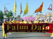 在第一天游行结束后一个墨西哥裔妇女跟着花车上的学员学炼第三套功法。然后她兴奋的说她的背痛在炼了5分钟之后就消失了。她不仅抓紧跟在学员后面学习其它几套功法,而且还要到很远的炼功点去炼功。最后她主动的要了很多传单要让更多的人了解法轮功。