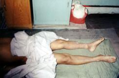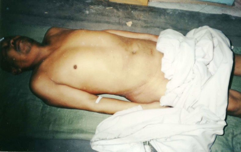 第二天(12月31日),我和孩子要求给他爸擦洗整理,穿衣服,但只让孩子进去,没让我进去(不知这是哪家法律),孩子出来说:“我爸咋那么瘦了,而且死不瞑目,我给摩挲上了(后来还发现赵英奇的右肋缺块肉,臀部两边各一块黑紫色,头部塌陷,右嘴角流至耳朵有血迹,手指青紫顺延到脖子及后背,2002年12月30日他的腹腔特别瘦,后又打水,人才显得略“胖”。 )女儿要买刮胡刀给她爸刮胡子,被孩子他二叔(赵英齐同父异母的弟弟)给制止了,而且没让穿衣服,让我们先回家,让矿上和劳教所找我们,然后再进行交涉。