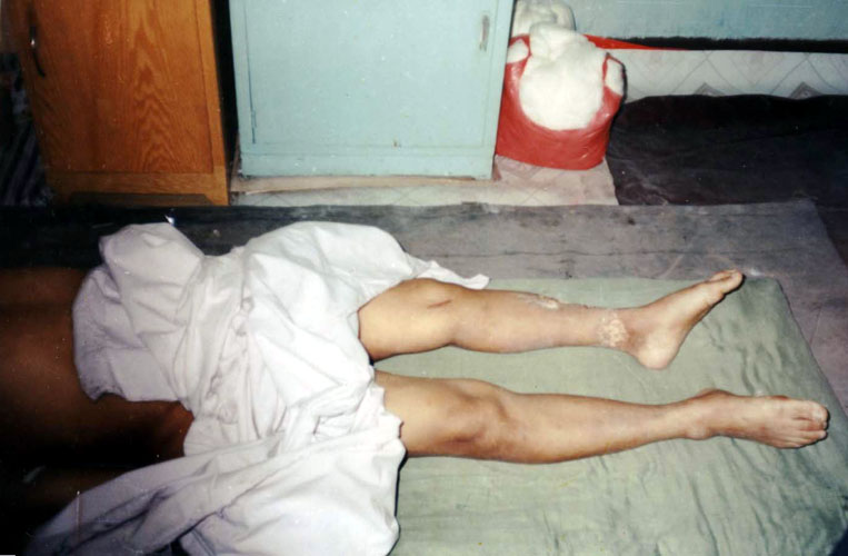 赵英奇,男,59岁,满族,小学文化,开滦南范各庄矿退管科工人,1987年于矿井下受重伤,左大腿四分之一处开放性粉碎骨折,由医疗事故造成赵英奇被做了三次植骨大手术,住院九年之久,拄双拐,坐摇车,脸色呈灰色,左腿短缺五公分,膝关节不能回弯,大便不能下蹲,给生活带来很大痛苦。