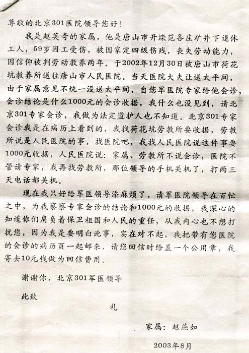 另外,据知情者讲,2002年12月28、29号劳教所通知矿上接人,矿上没接。还有,因为赵英奇是四级伤残,明摆着劳教所不该收,是矿上给劳教所送礼才把赵英奇收下的。劳教所也讲过,我们不该收,矿上也不该送。赵英奇从2002年10月17日被绑架后直至被迫害致死的75天,我们被剥夺了探视权。赵英奇被关押在唐山市第二看守所时,女儿到矿分处开信去看她爸爸,分处门卫不让进,门卫打电话请示后说,李和平不在,女儿又到退管科开信,书记顾来存也不给开,女儿对顾来存讲:“为什么我爸的腿不好还给送劳教所去?”顾来存说:“八十‘犯法’也不行。”我丈夫是孝敬老人疼爱孩子的好儿子、好父亲,犯了什么法?
