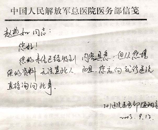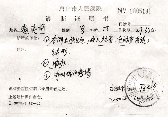 2002年12月30日晚七点左右医院两次通知我送太平间,怎么03年1月2日晚8点零2分又一次通知死亡呢?我在03年4月份得到了病历,看到病历首页写着03年1月2日抢救一次成功,临时医嘱写着:2003年1月1日专家(北京301医院)会诊费一千元。03年7月25日我给荷花坑劳教所一大队艾振民打电话要北京301医院专家会诊的结论和一千元的收据,艾振民惊慌失措的说:“那是医院的事,你找医院吧。”我打电话找到医院石文建主任询问此事。石文建又推给劳教所,我说是劳教所让找医院的。石文建说:“那好,你找劳教所的领导,你们一块来医院,我给你们当面说清楚。”据石文建说,劳教所表示要花这钱的。后来我给艾振民打电话,他都关机。