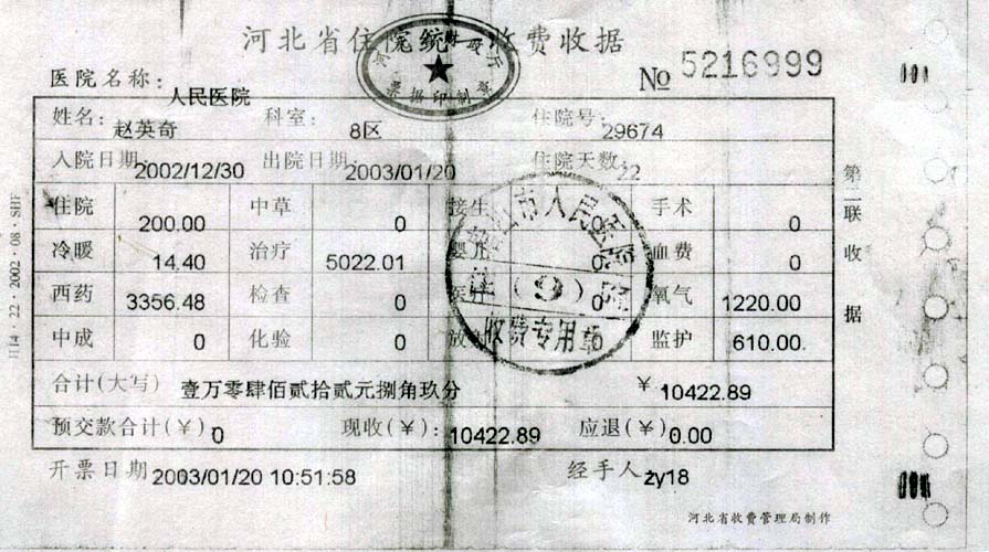 2004年3月19日,家属去人民医院开明细表,找到石文建主任问他北京301医院的专家会诊怎么解释?石文建说:“不光这一项,还有老干部处治费3090元。”家属继续询问老干部处治费怎么解释。石文建说:“这钱劳教所说它们花,市委书记陈满亲自下的令,不惜一切代价也得抢救。”请问给谁抢救?人都死了,我看是一万多元的药费走医疗保险,这可是老百姓的钱,不给百分之百的报销,我个人还得承担。不但人给我害死了,在经济上,我还得为这些知法犯法者“报销”。我丈夫从九四年八月开始修炼,没花过社会一分钱医药费,这一万多元的医药费至今我也没报销。