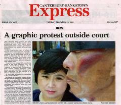报道说:星期五(12月10日)在纽省高等法院外的这个使人不安的场景,表现得逼真、可怕。但它却是反对中国政府对法轮功追随者进行的酷刑和杀戮的一次逼真的舞台式的抗议。
