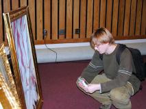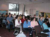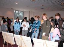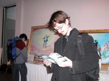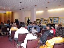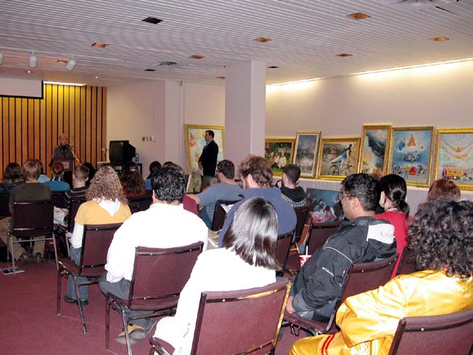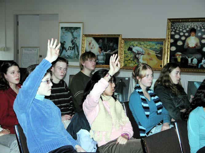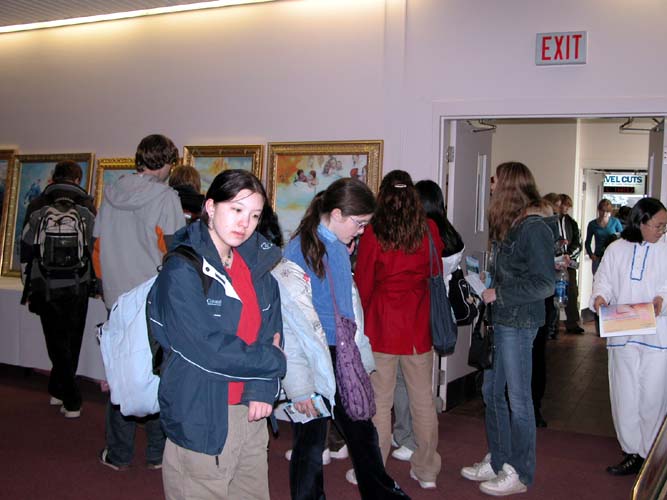 每天有众多观众前来参观,第一天就有百余名师生前来参加开幕式和参观画展。尤其值得一提的是开幕式那天,当地一位姓董的高中教师,带着他11年级的27名学生,冒着大雪,步行2公里,专程来参观画展,为他的学生们上一堂世界信仰课。开幕式上,学员简单介绍了什么是法轮大法,并表演了5套功法。学生们非常感兴趣,问了很多关于法轮大法的问题, 比如: