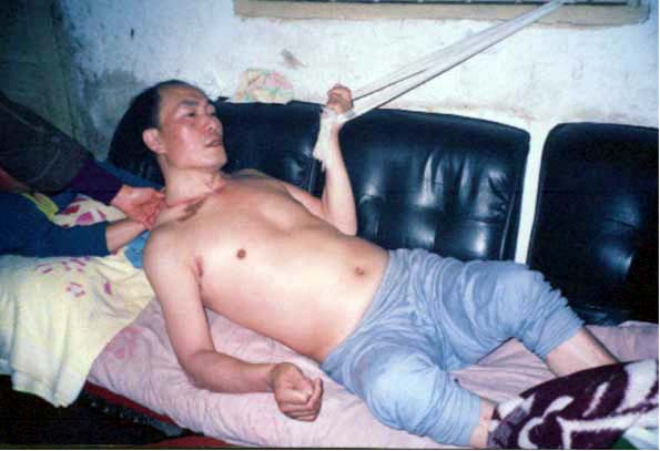 2002年9月至2004年9月,王良均一直被关押在都匀的监狱,他在床上整整躺了两年。2004年9月他被六盘水公安拖回后扔在家中,至今卧床不起。他的双耳几乎失聪,已经听不见亲朋们对他说什么了;他看字要手指头大的字才能勉强看见。他一句又一句的告诉周围的人:“我被拖怕了,我被拖怕了!”“他们把我拖着(在地上)走,我被拖老火了(严重了)!”“我被饿坏了!”(他曾被饿过十五天)。他的颈部在监狱被折磨受伤,至今还有如项链一圈的伤痕(见上图),现在他说话发音也不太清楚。从他断断线续的讲述中,让人已经感受到他在都匀的监狱中经历了地狱般的残酷折磨。