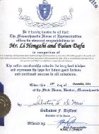 褒奖李先生为使人们改善健康、提高道德水平的教导,并肯定中国的法轮大法修炼者们,他们在个人极端危险的情况下,仍然坚持他们修炼真善忍信仰的权利。谨祝真善忍画展和各项文化活动获得巨大成功。
