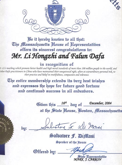 玛萨诸塞州众议院向李洪志先生和法轮大法致以最衷心的祝贺 !